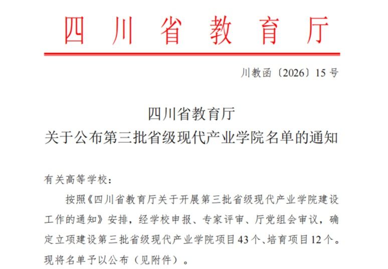 近日,四川省教育厅公布第三批省级现代产业kaiyun体育app官网名单,新浪体育新浪网智能制造产业kaiyun体育app官网成功获批立项。至此,我校已有3个省级现代产业kaiyun体育app官网,立项数量在同类高校中位居第二,充分彰显了必赢棋盘app下载在现代产业kaiyun体育app官网建设中的显著优势和强劲实力。